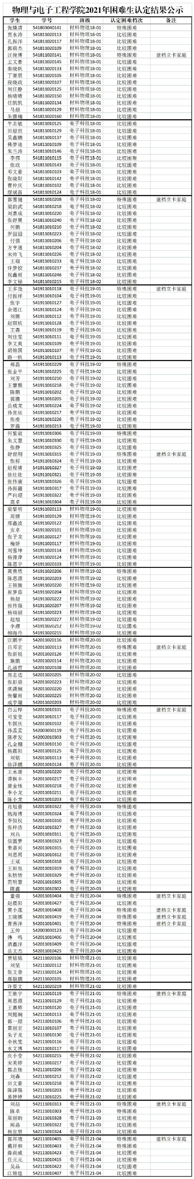 根据学校《关于开展2021年家庭经济困难学生认定工作的通知》精神,物理与电子工程学院成立了家庭经济困难学生认定评议小组,对2021年申请家庭经济困难认定的学生进行了民主评议,现将各班级评议排名予以公示,公示日期9月16日—9月22日。对公示结果有异议者,请于9月22日前向班级困难生认定评议小组反映。物理与电子工程学院2021年9月16日(注:本次结果仅针对各班申请困难生认定的全部学生综合情况进行定档和排序,非国家奖助学金结果。)