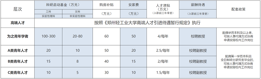 引进人才同时享受国家、省、市相关人才政策支持。目前郑州市“黄河人才计划”部分待遇有:对毕业3年内(海外留学优秀人才毕业6年内)来郑工作的全日制博士研究生,按每人每月1500元标准发放生活补贴,最长发放36个月,首次购房发放补贴10万元。其他符合条件的人才配套政策,学校均积极协助支持博士本人按程序申报、申领。若夫妻双方均引进的,安家费、人才津贴、科研启动基金按照个人标准发放或拨付,购房补贴按较高一方全额、另一方1/4额度标准发放。