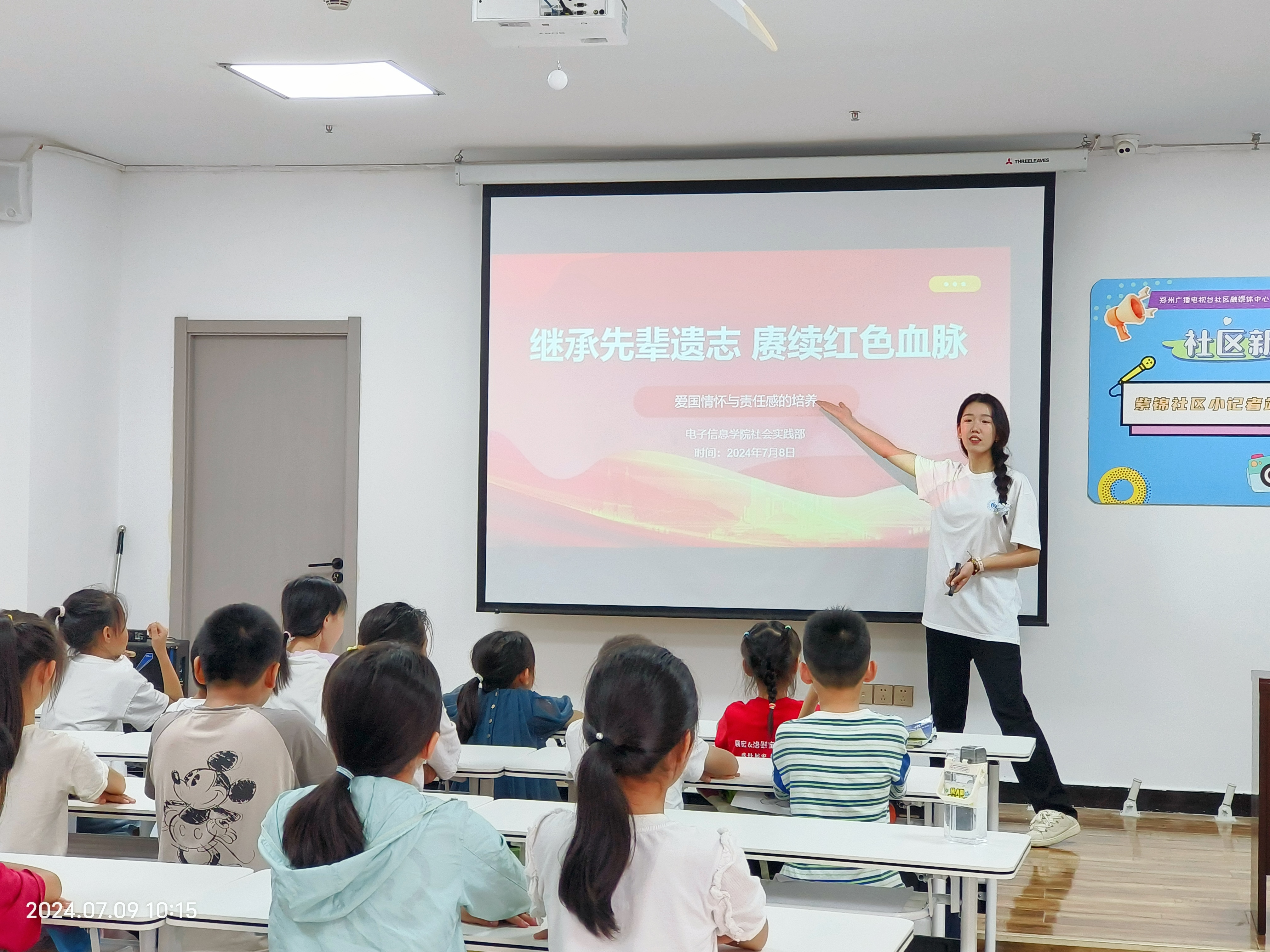 7月9日上午,实践队成员一行人来到了高新区沟赵乡紫锦社区青少年活动中心,通过PPT给社区青少年分享了在中原英烈馆的所见所闻,讲述先烈红色故事,与他们交流互动,让社区青少年们在轻松愉快的氛围中深入了解国家的历史与现状,明确他们作为新时代少年的使命与担当,培养他们的爱国情怀与责任感。同时引导社区青少年们进行了讲解员的模拟演练,鼓励他们向家人和朋友们讲述所学到的红色故事,不仅让青少年们的表达能力得到了锻炼,更让红色基因在他们心中生根发芽,代代相传。