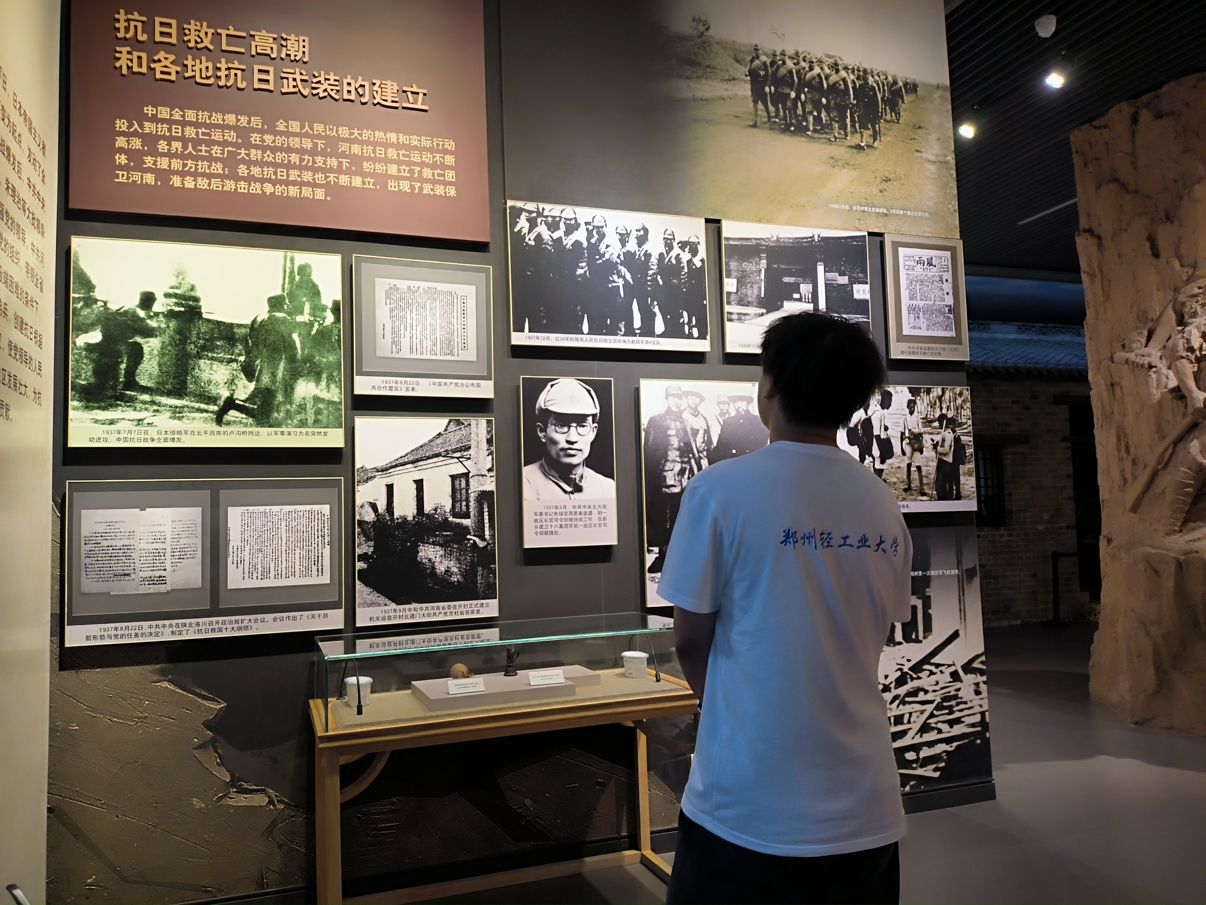 随后,队员们进入中原英烈纪念馆。纪念馆共有三层11个展厅,一层包含工人革命与大革命浪潮展厅、土地革命展厅、抗日战争展厅和解放战争展厅四个展厅。馆中耸立着一尊尊烈士雕塑,每一个都栩栩如生,仿佛在诉说着那段被鲜血染红的岁月。馆中一件件历史实物、一幅幅珍贵图片、一幕幕感人场景、一个个动人故事,让大家重温了战火纷飞的革命岁月。在风雨如晦的年代,是革命先辈高举信仰的火炬,义无反顾地踏上为了民族独立、人民解放而奋斗的征途。