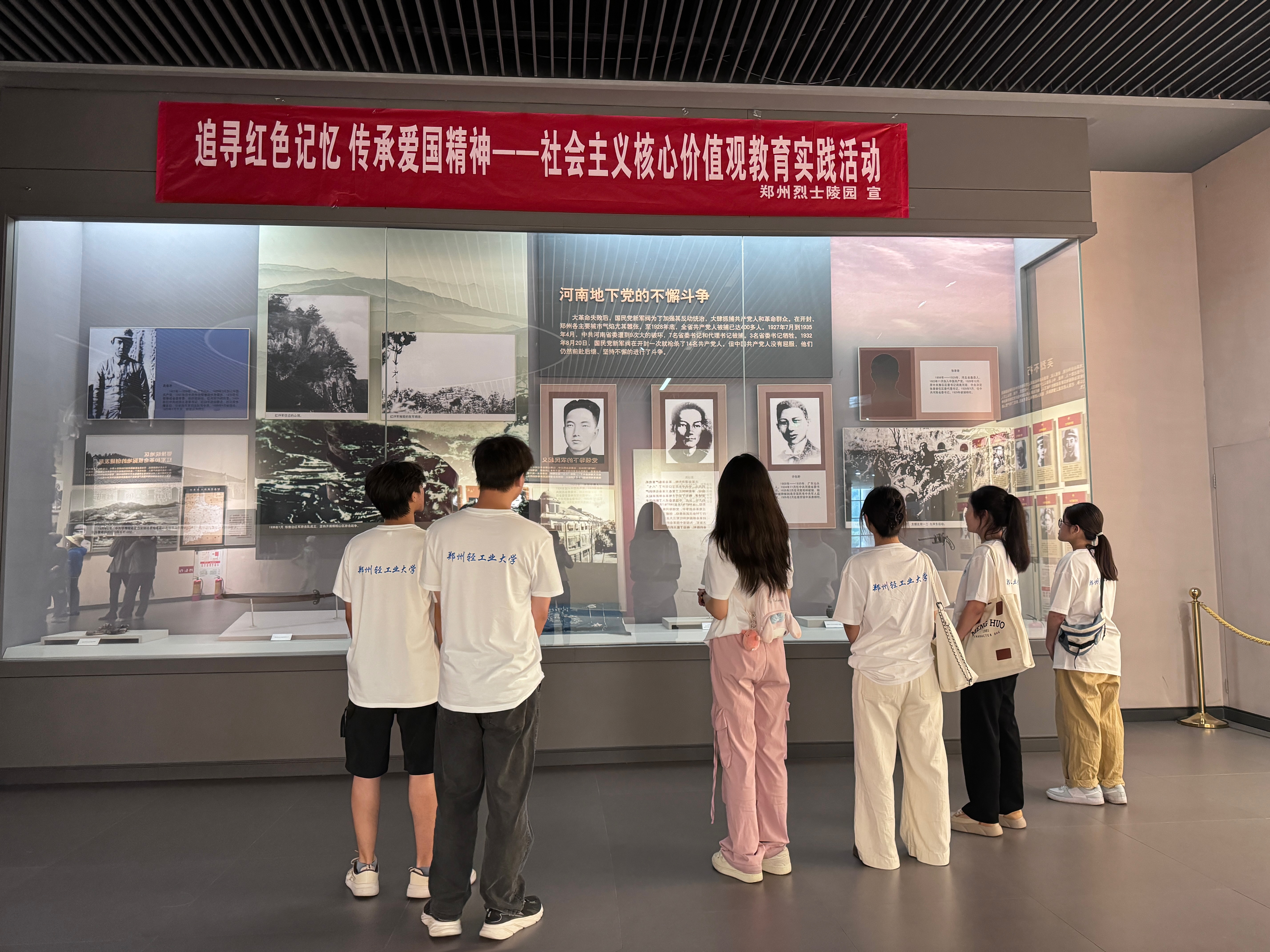 三层是社会主义时期烈士纪念厅,记录了新中国成立以来牺牲的中原英烈事迹。“英烈们的精神永存,历史的教训不可忘记。”参观结束离开时,那些英烈的雕塑仿佛在告诉实践队成员:勿忘历史,珍惜和平,勿忘初心,砥砺前行。