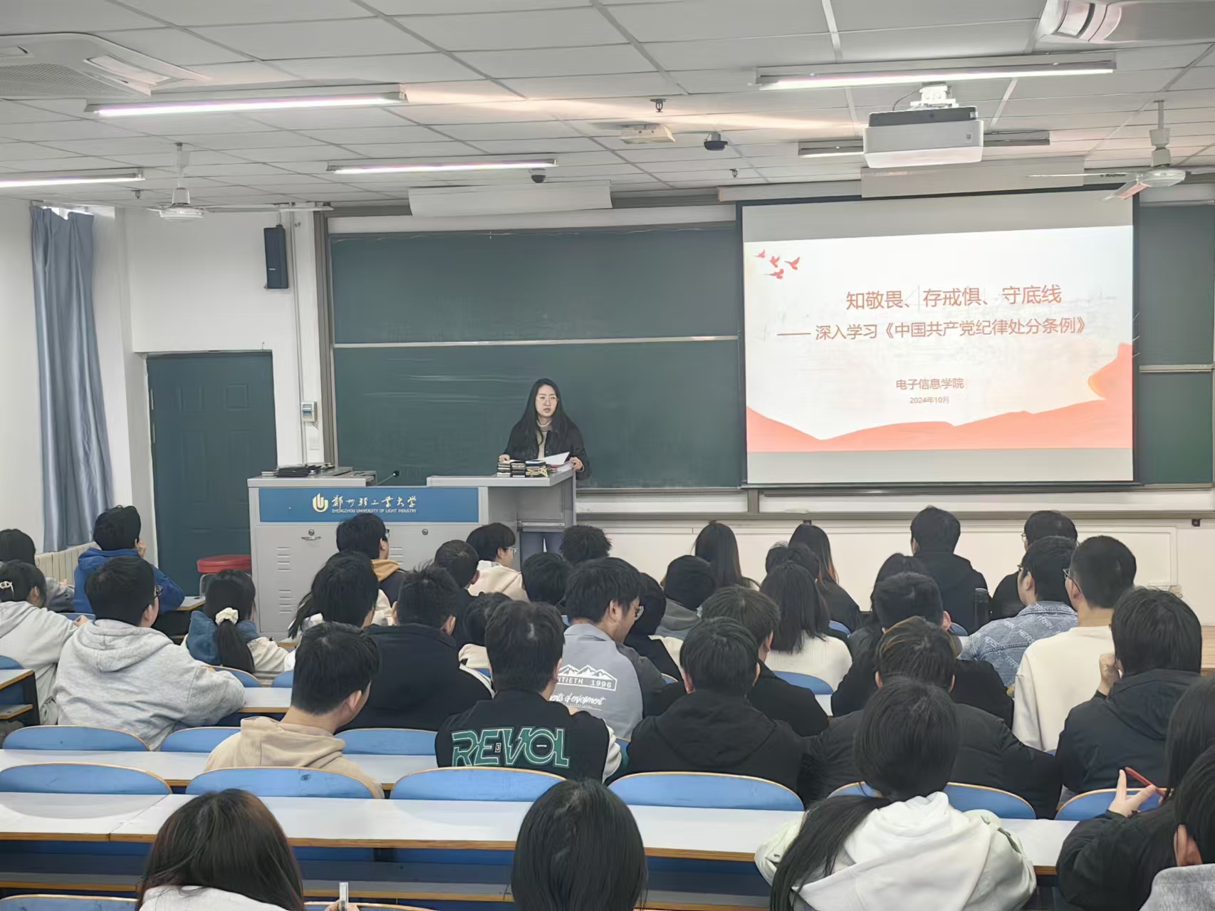 10月24日,成人短剧 在二交楼教楼514开展“知敬畏、存戒惧、守底线——深入学习《中国共产党纪律处分条例》”专题党课。此次党课由学院副科级组织员李夏楠主讲,学院第72期积极分子全员参加了党课学习。