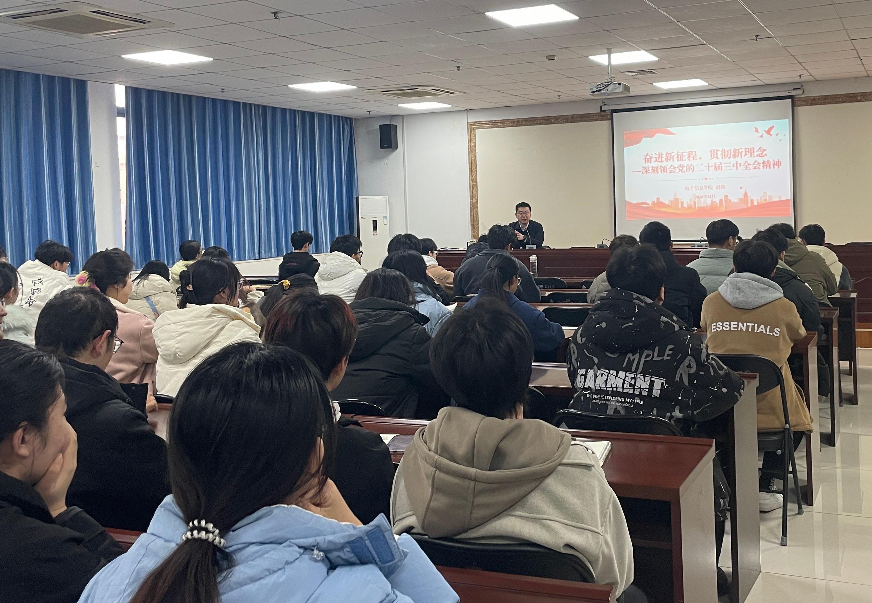为深入学习二十届三中全会精神,12月19日,成人短剧 党委书记赵阳以“奋进新征程,贯彻新理念”为主题,为学生入党积极分子和发展对象讲授了一堂专题党课。