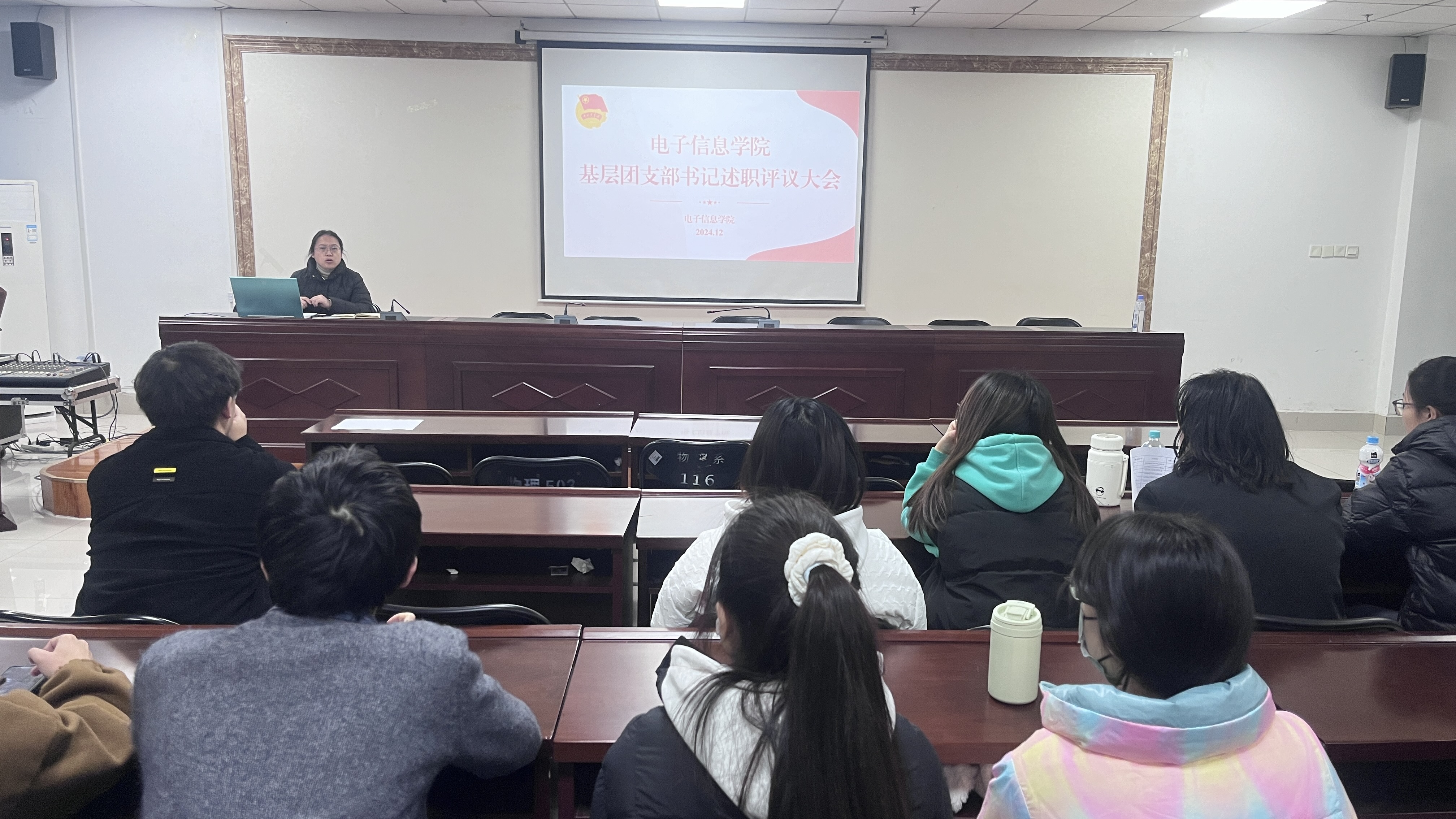 在四教楼503会议室召开2024年度基层团支部书记述职评议大会,学院团委书记周芳华老师、各班级团支部书记参加了本次会议。