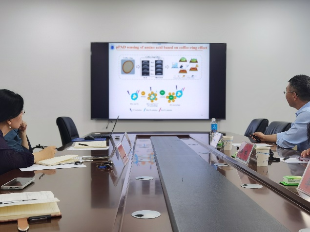 韩琳教授就微纳生物芯片在生命健康领域的应用研究进行了详细汇报,具体介绍了生物芯片的应用背景及其团队在蛋白分子传感芯片、细胞外囊泡芯片和单细胞芯片等方面取得的最新研究成果。罗立强教授就功能纳米材料在生物传感器分析中的应用进行了汇报,他深入浅出地阐述了纳米材料的独特性质及其在生物传感领域的应用前景,介绍了其团队制备的功能碳纳米材料在葡萄糖及生物标志物检测方面取得的应用成果。会后,学院教师和两位教授就相关问题进行了深入讨论。