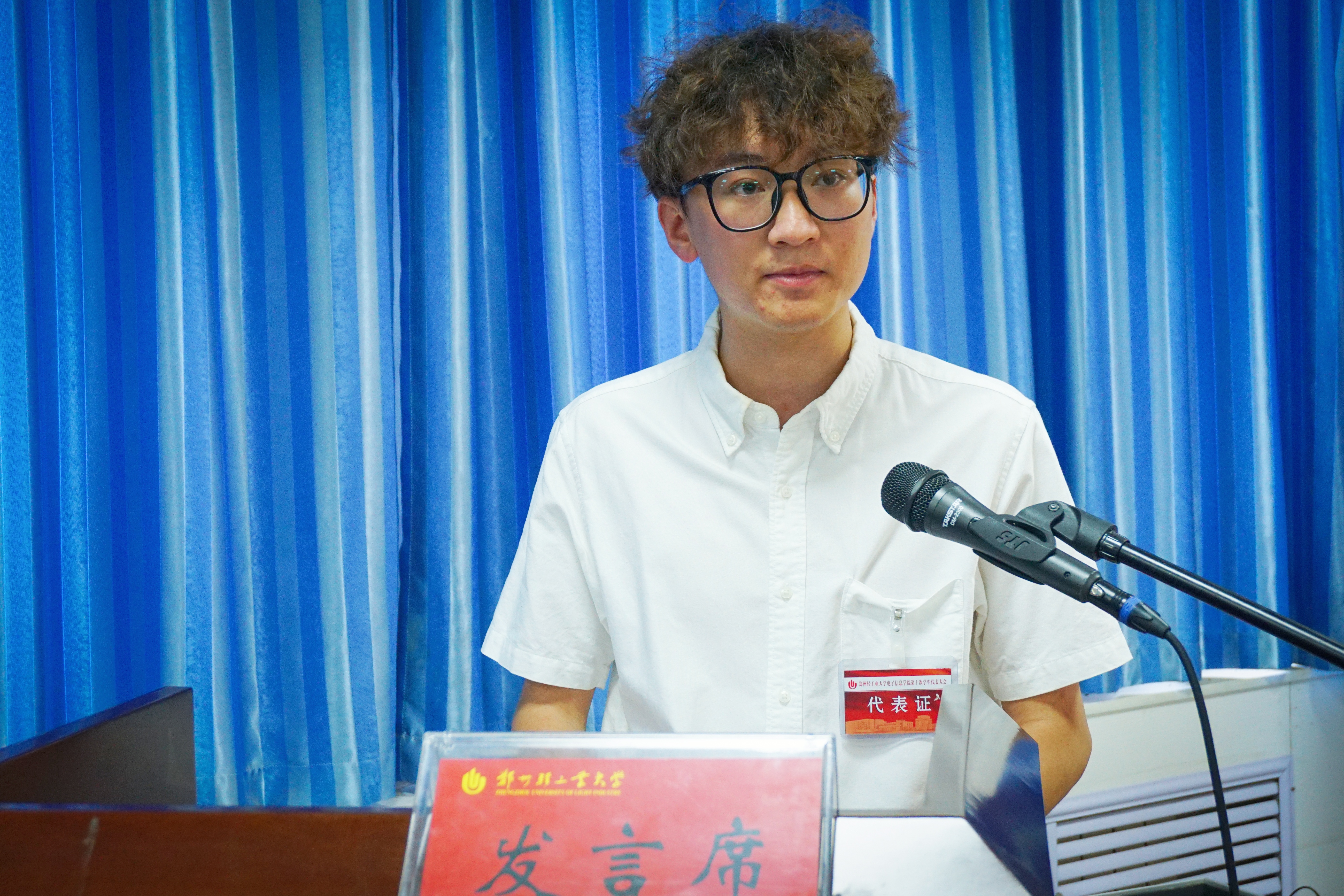 院学生会主席团成员贾梓辰代表学院上一届学生会做工作报告,报告从深化改革、思想引领、学风建设、校园文化活动、社会实践等方面,全面总结了学院学生会在上一年度取得的成绩,客观分析了学生会工作存在的不足,希望新一届学生会成员能继续团结带领学院同学,求真务实,发展创新,推动学院学生工作实现新发展。工作报告得到大会代表高度肯定,获得一致通过。