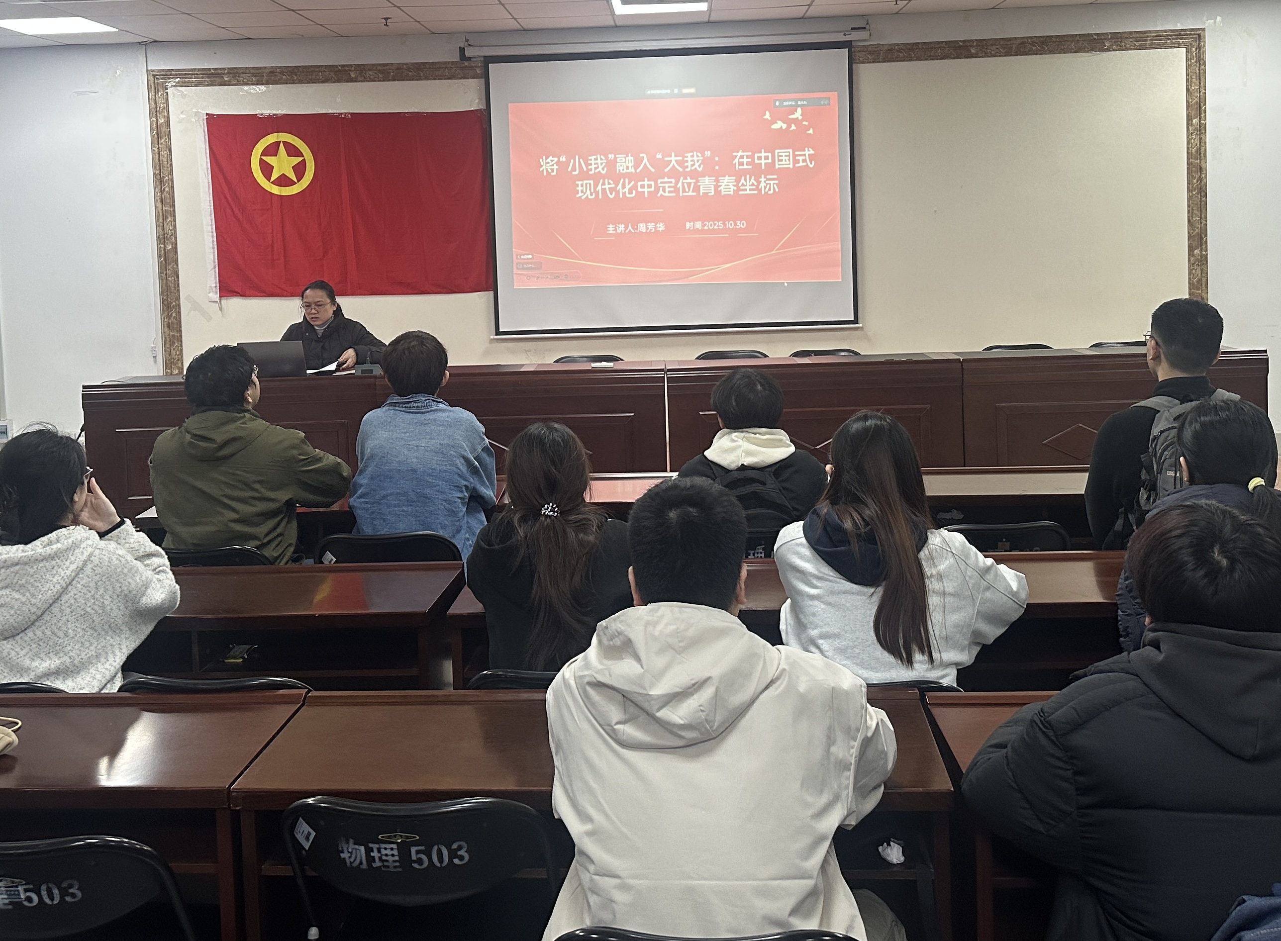 在四教楼503会议室开展“在中国式现代化中定位青春坐标”主题团课。本次团课由校青年讲师团成员、学院团委书记周芳华主讲,学院全体入团积极分子参加了学习。
