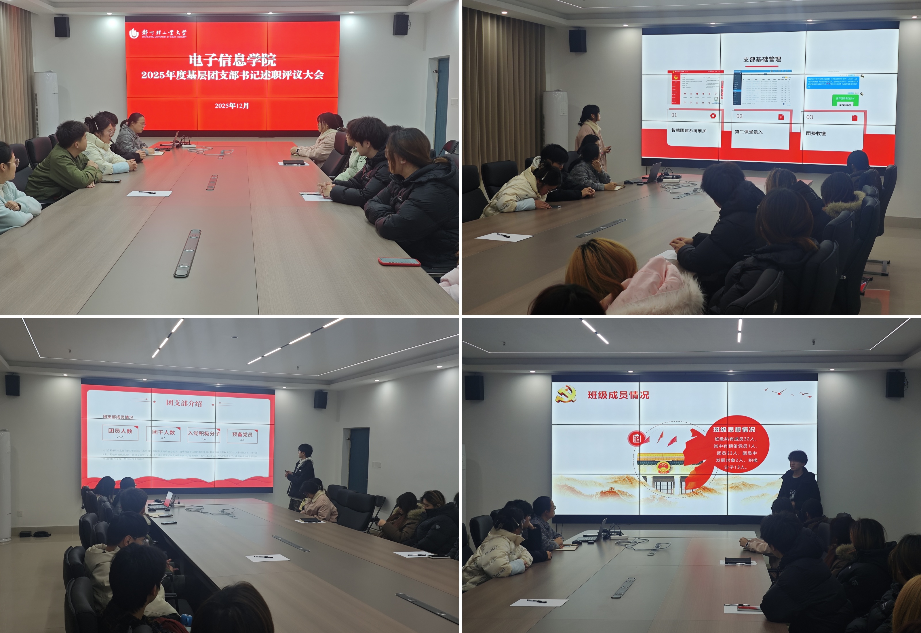 在四教楼305会议室召开2025年度基层团支部书记述职评议大会。学院团委书记周芳华、专职辅导员及各班级团支部书记共同参会。